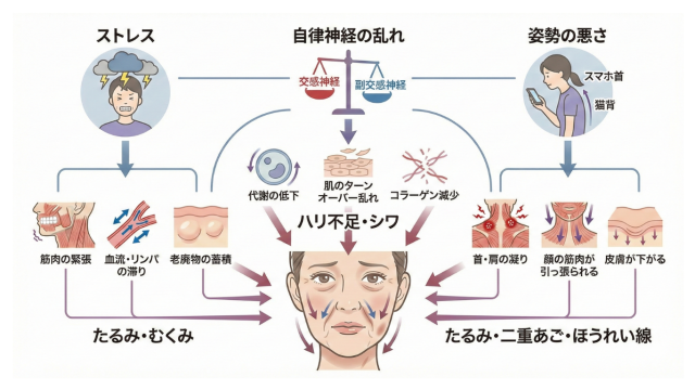 この図のようにストレス×自律神経の乱れ×姿勢の悪さは、顔のたるみや加齢などにでてしまいますが