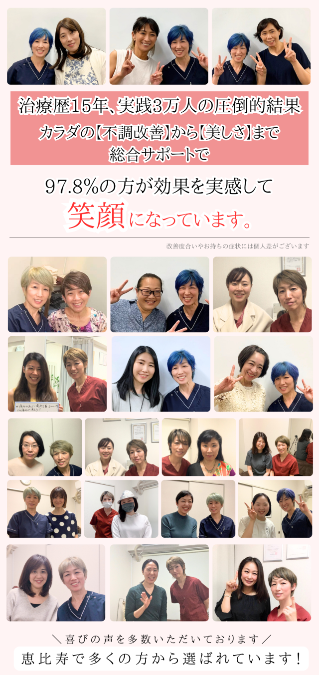 今、ご来院された方々は施術を受けて、みなさん改善されて笑顔になられ、私はそれが何よりも一番嬉しいです!