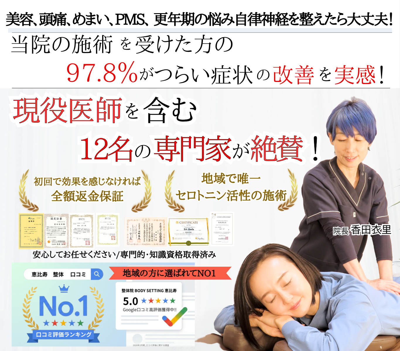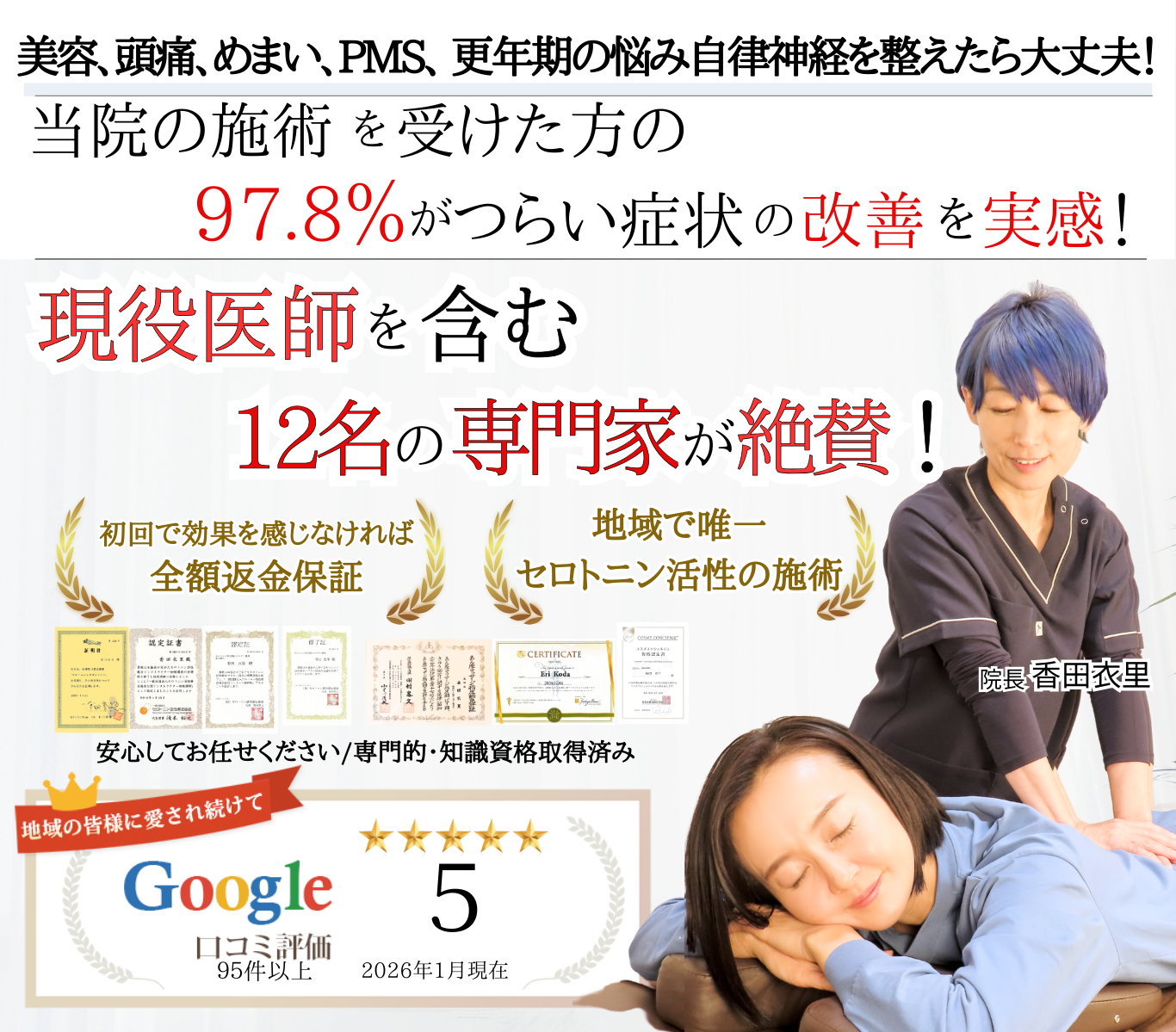 1,国家資格所有の専門的知識と技術だから、自律神経の乱れによる不調、症状に特化した施術ができる |