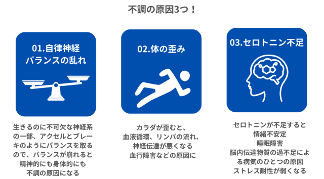 つまり、自律神経の乱れ、ストレス、姿勢の悪さの3つが不調が続く原因なのです。